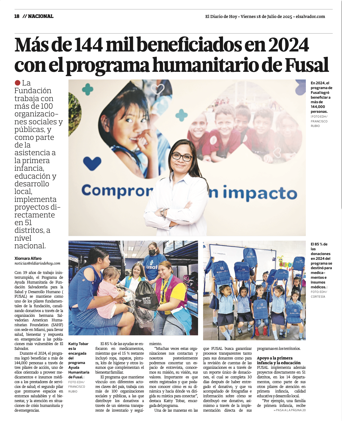 En medios de comunicación, el trabajo de posicionamiento generó un PR Value estimado de USD 288,992, impulsado por hitos como la difusión de la Memoria de Labores 2024, las entregas de donativos del Programa de Ayuda Humanitaria, la campaña “Pasos con Dignidad” realizado en coordinación con OIM y ADOC, la Campaña Nacional del Libro con FEPADE y Fundación TCS, actividades del Programa de Primera Infancia y el primer encuentro de las organizaciones que forman parte de ConexionES, entre otros espacios que contribuyeron a visibilizar el impacto de FUSAL.